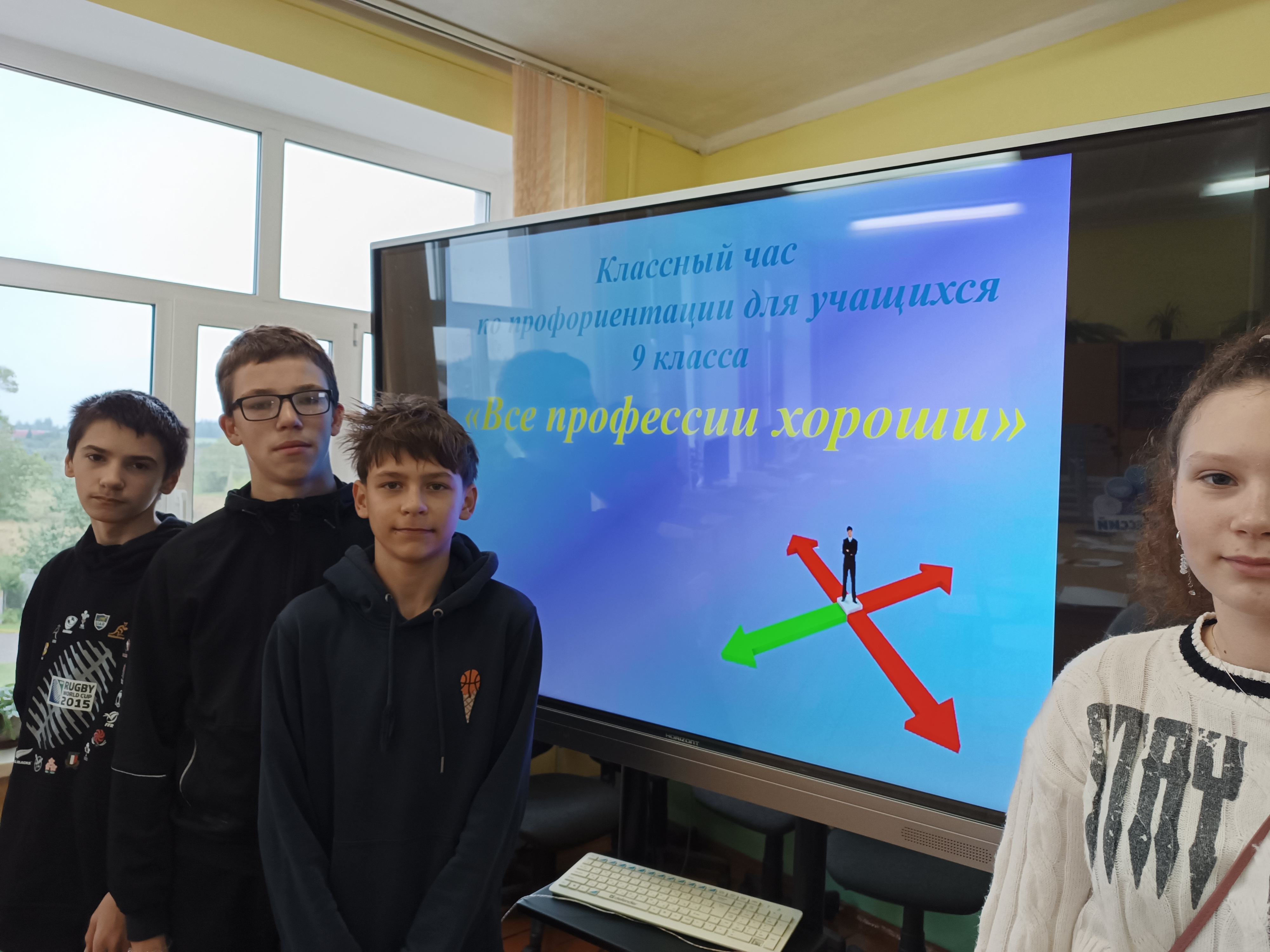 Шестой школьный день 20 сентября был посвящён профориентационной работе с учащимися. Учащиеся 9 класса приняли участие в игре "Все профессии хороши!" Мероприятие было направлено на активизацию мотивации профессионального самоопределения учащихся. В конце мероприятия ребята сделали вывод: выбор профессии - один из самых важных и решающих шагов в жизни каждого человека, от которого будет зависеть его дальнейшая деятельность. Не зря ведь говорят: "Счастье - это когда утром с радостью идёшь на работу, а вечером с радостью возвращаешься домой".